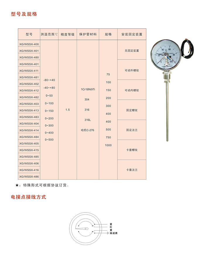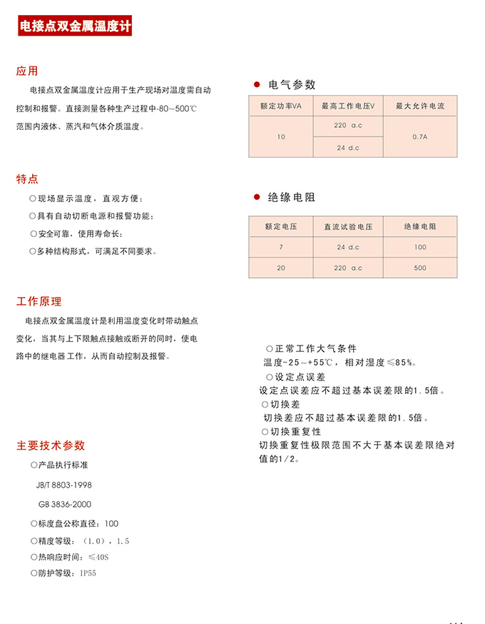 电接点双金属温度计应用于生产现场对温度需自动控制和报警。电接点双金属温度计可直接测量各种生产过程中-80-500℃范围内液体、蒸汽和气体介质温度。