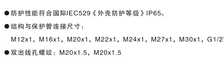 结构与保护管连接尺寸:M12x1,M16x1,M20x1,M22x1,M24X1,M27X1,M30X1,G1/2"