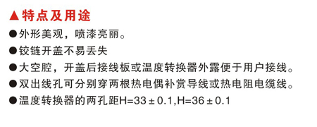 ●大空腔,开盖后接线板或温度转换器外露,便于用户接线。