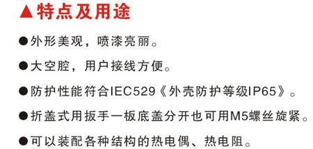 电线管与接线盒连接,线管里面的电线在接线盒中连起来,起到保护电线和连接电线的作用。热电偶和热电阻接线盒是用来固定接线座和作为连接器的装置,它起着保护感温元件免受外界气氛侵蚀和使外接导线与接线柱接触良好的作用,根据被测量温度对象和现场环境条件及要求,除了普通型接线盒外,还有防溅型、防水型、防爆型、接插型、不锈钢、塑料和一体化温度变送器等接线盒。我们如果将各种类型的接线盒装配成热电偶和热电阻产品,则这些产品相应即为防溅型、防水型和接插型等热电偶和热电阻了。