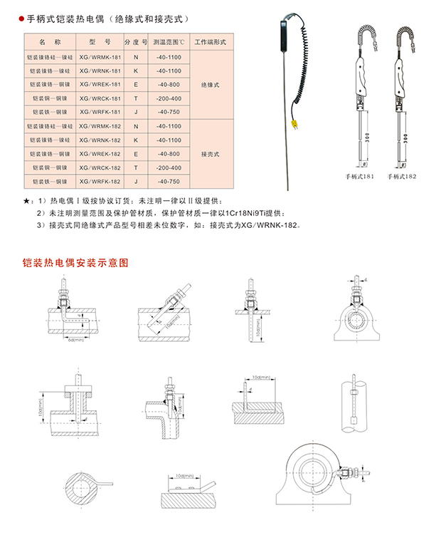 手柄式铠装热电偶是温度测量中应用醉广泛的温度器件,他的主要特点就是测温范围宽,性能比较稳定,同时结构简单,动态响应好,更能够远传4-20mA电信号,便于自动控制和集中控制。另外,热响应时间少,减少动