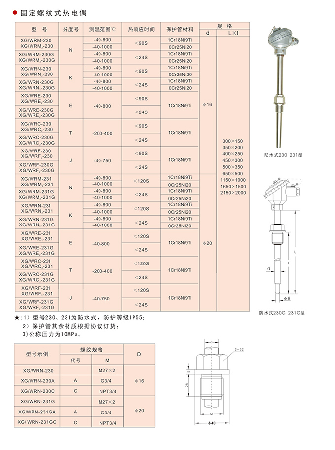 固定螺纹式装配热电偶作为一种温度传感器,通常和显示仪表,记录仪表和电子调节器配套使用。可以直接测量各种生产中从0℃到1300℃范围的液体蒸汽和气体介质以及固体的表面温度。热电偶通常由感温元件、安装固定装置和接线盒等主要部件组成。是目前用量大的廉金属热电偶,其用量为其他热电偶的总和。K型热电偶丝直径一般为1.2~4.0mm。正(KP)的名义化学成分为:Ni:Cr=92:12,负(KN)的名义化学成分为:Ni:Si=99:3,其使用温度为-200~1300℃。