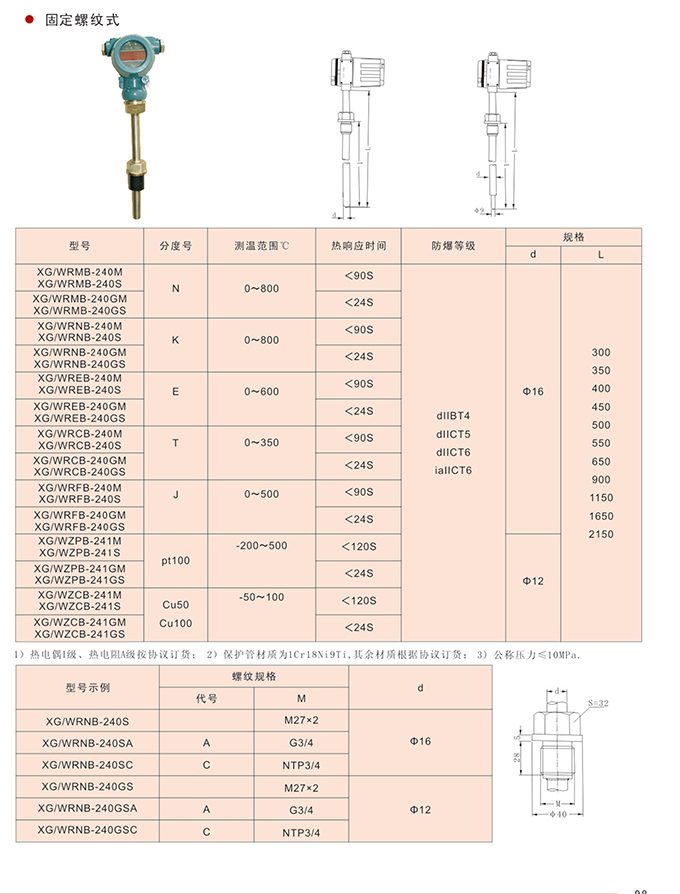 固定螺纹式,现场显示一体化热电偶(阻)一种新型结构的测温仪表,现场LCD或LED数字显示,温度变送器二线4~20mA.DC信号输出,感温元件可采用铠装压簧式抗震结构,感温元件与上保护管采用圆筒隔爆结