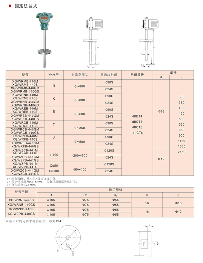 固定法兰式,现场显示一体化热电偶(阻)一种新型结构的测温仪表,现场LCD或LED数字显示,温度变送器二线4~20mA.DC信号输出,感温元件可采用铠装压簧式抗震结构,感温元件与上保护管采用圆筒隔爆结