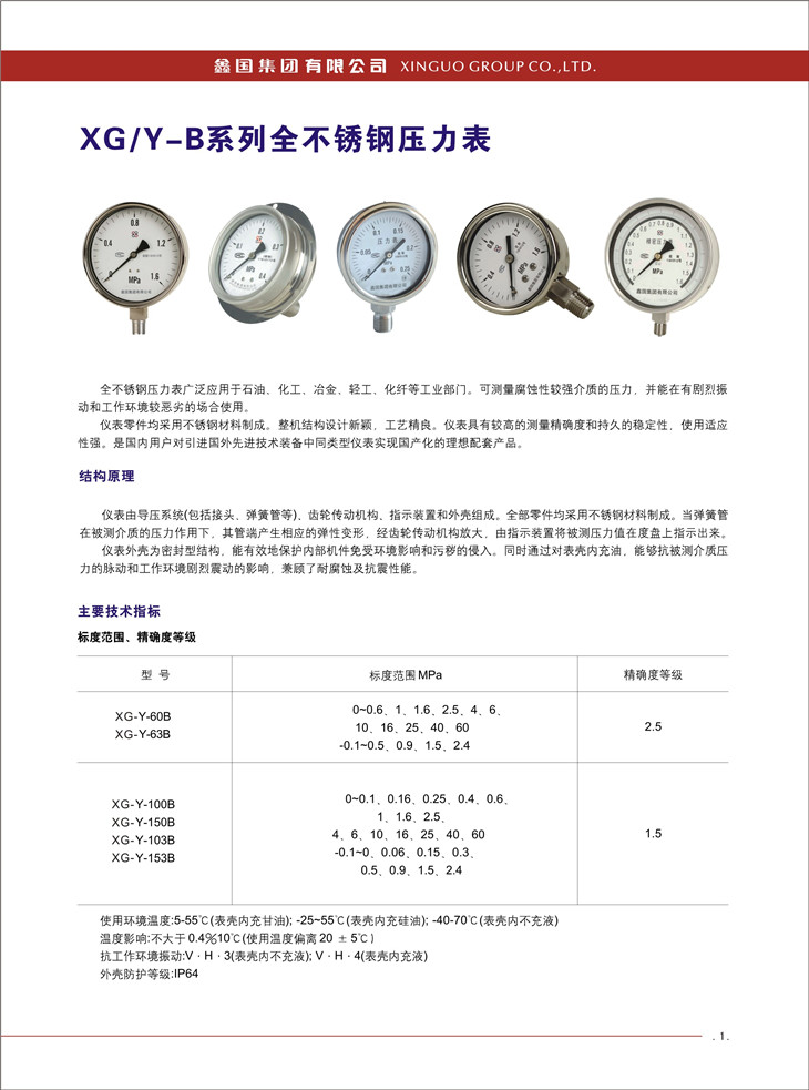 全不锈钢压力表零件均采用不锈钢材料制成。整机结构设计新颖,エ艺精良。仪表具有较高的测量精 确度和持久的稳定性,使用适应性强,是国内用户对引进国外先进技术装备中同类型仪表实现国产化的理想配套产品。