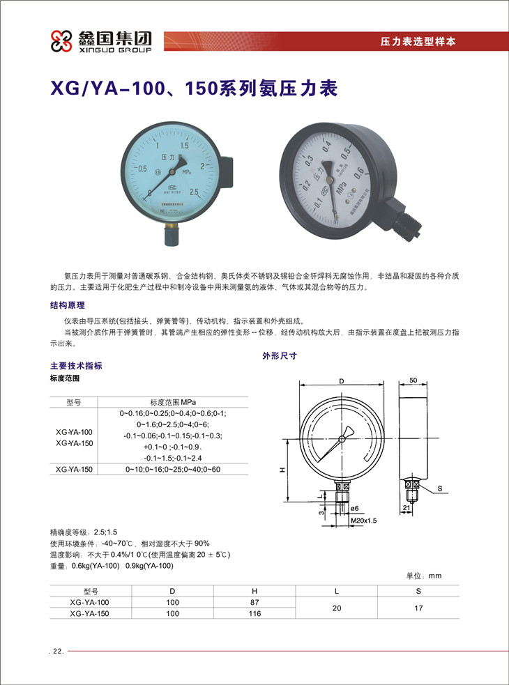 XG-YA-100/150系列氨压力表,氨压力表用于测量对普通碳系钢,合金结构钢,奥氏体类不锈钢及锡铅合金钎焊料无腐蚀作用,非结晶和凝固的各种介质的压力。氨压力表主要适用于化肥生产过程中和制冷设备中用来测量氨的液体,气体或其混合物等的压力。