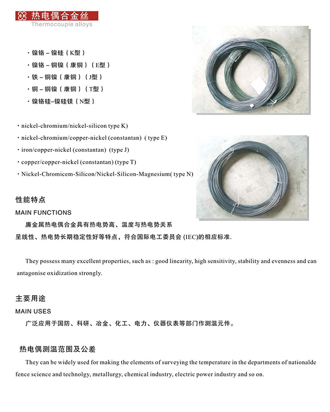 热电偶合金丝广泛应用于国防、科研、冶金、化工、电力、仪器仪表等部门作测温元件。