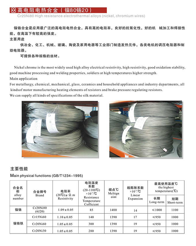 高电阻电热合金,供冶金、化工、机械、玻璃、陶瓷及家用电器等工业