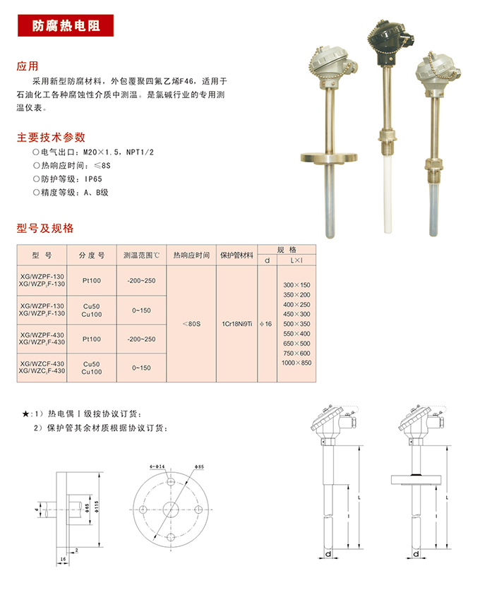 防腐热电阻,采用新型防腐材料,外包覆聚四氟乙烯F46,防腐热电阻适用于石油化工各种腐蚀性介质中测温,是氯碱行业的专用测温仪表。
