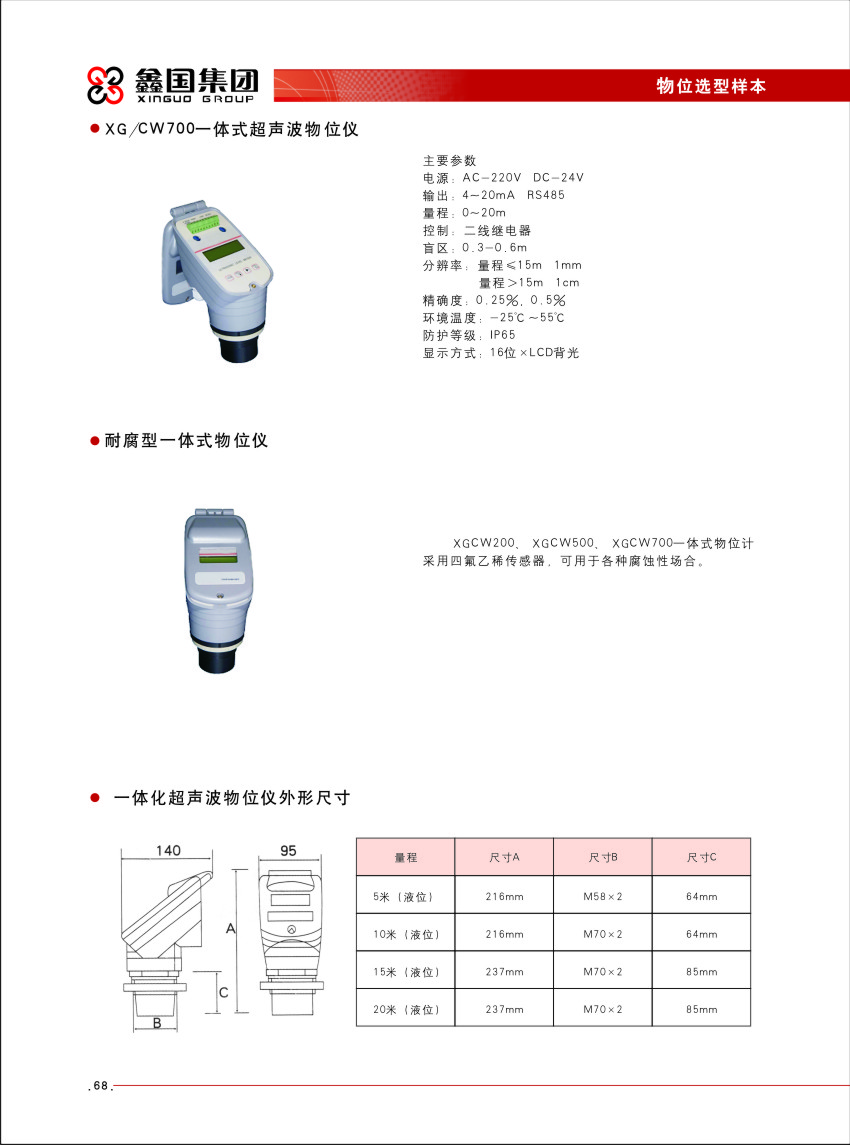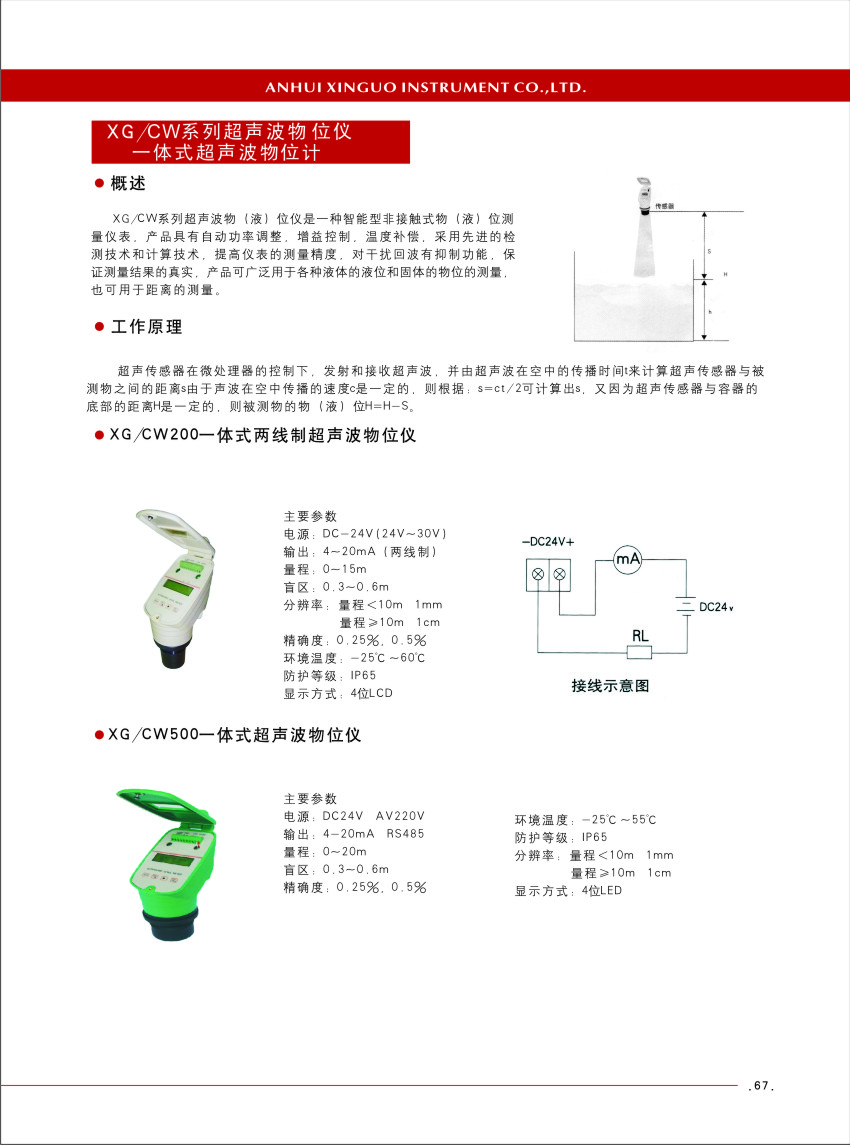 XG/CW 系列超声波物位仪,一体式超声波物位计。 XGCW 系列超声波物(液)位仪是一种智能型非接触式物(液)位测量仪表,产品具有自动功率调整,增益控制,温度补偿,采用先进的检 测技术和计算技术,
