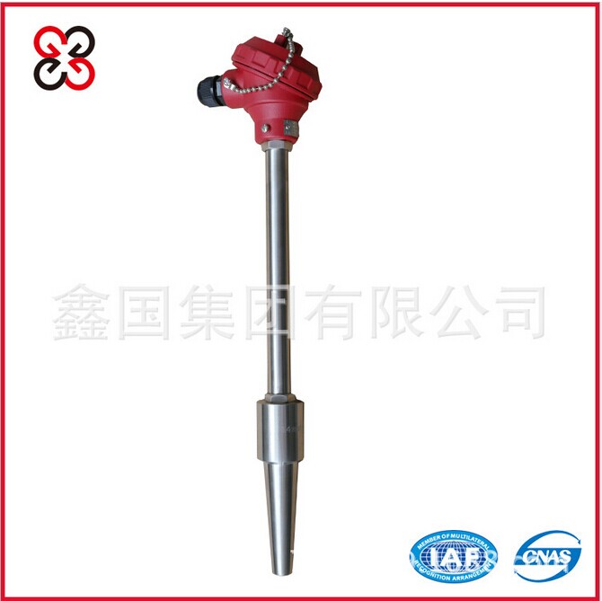 中温中压热电偶(热电阻),其整体钻孔保护套管采用焊接的方法与主设备固定密封,它可用来测量电厂管路的蒸汽或水温。根据所使用的压力、温度和流速的差异,具有两种相应的结构和安装方式,供用户选择。本热电偶(热电阻)采用分离式保护管结构,弹性压紧测量元件方式,配铝质的防水接线盒。