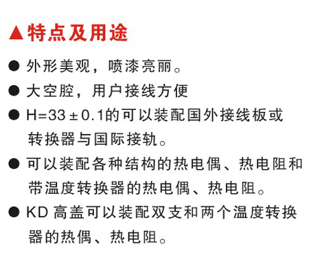 ●KD高盖可以装配双支和两个温度转换器的热电偶、热电阻。
